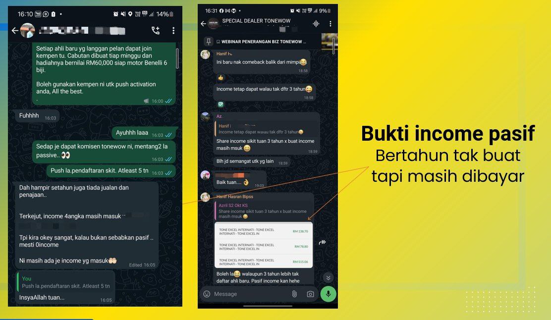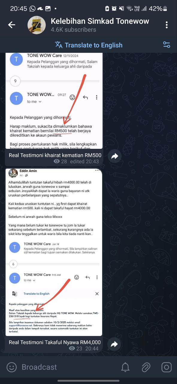 Lebih dari 4 Telegram Channel padat dengan info berkenaan Tone WOW. Daripada cara guna simkad, info detail pelan data, perlindungan takaful, dan lain-lain, malah anda juga dapat join sekali channel bagaimana untuk hasilkan side income dengan Tone Wow. Bahan promosi juga di berikan di dalam channel khas.