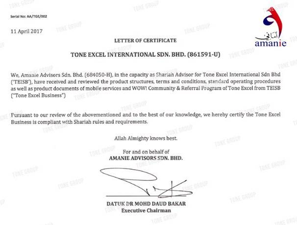 Tone Excel International Sdn Bhd telah menerima Sijil Patuh Syariah dari Amanie Advisor