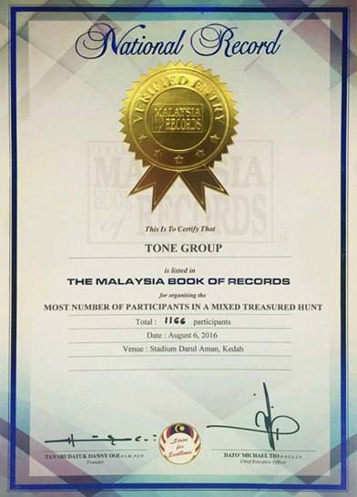 TONE GROUP telah mencipta rekod pada 2016 dengan jumlah penyertaan Treasure Hunt terbesar di Malaysia iaitu 1,166 penyertaan.